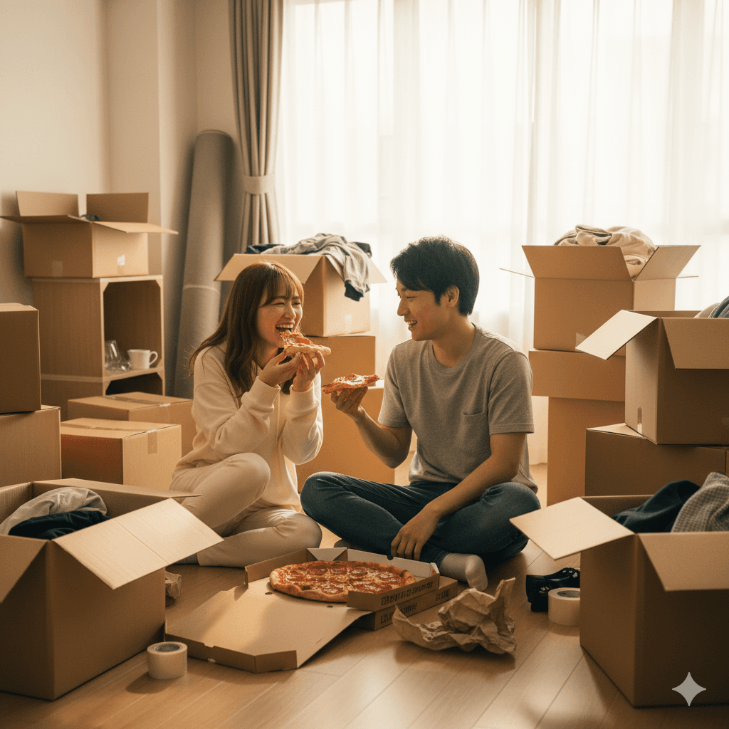 荷物を運び入れた日。ダンボールだらけのリビングで食べたピザの味。