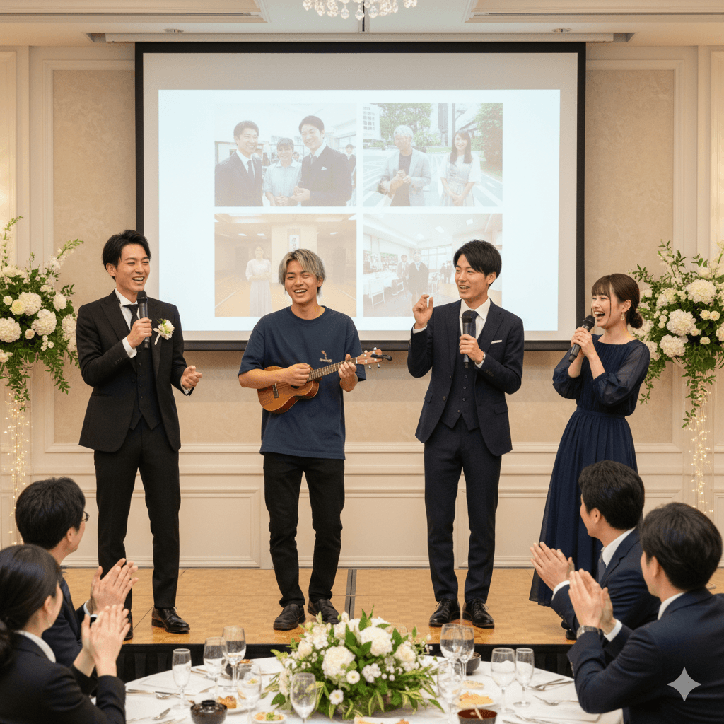 4人でスピーチ & 余興。練習の成果が出た!
