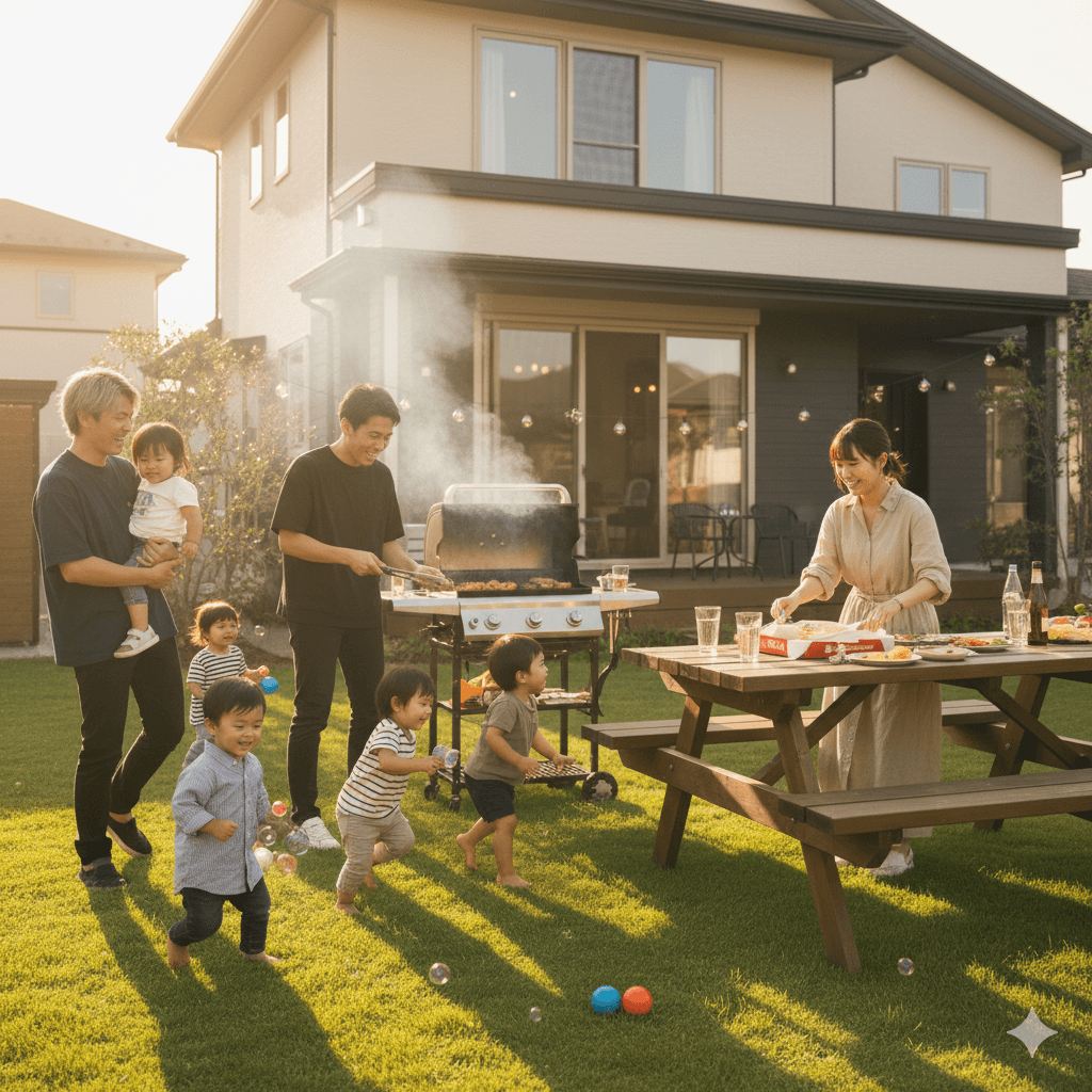 健太の新居で初BBQ。子供たちも混ざって大騒ぎ。